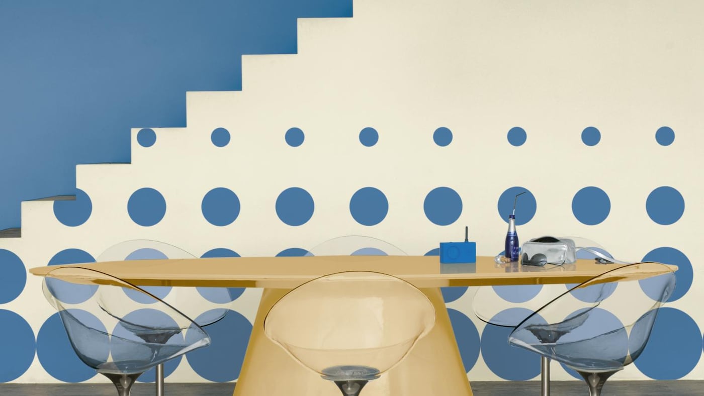 This dining space feels like part of an underwater world with deep blue walls, while the abstract bubbles on the sand-coloured staircase add interest.